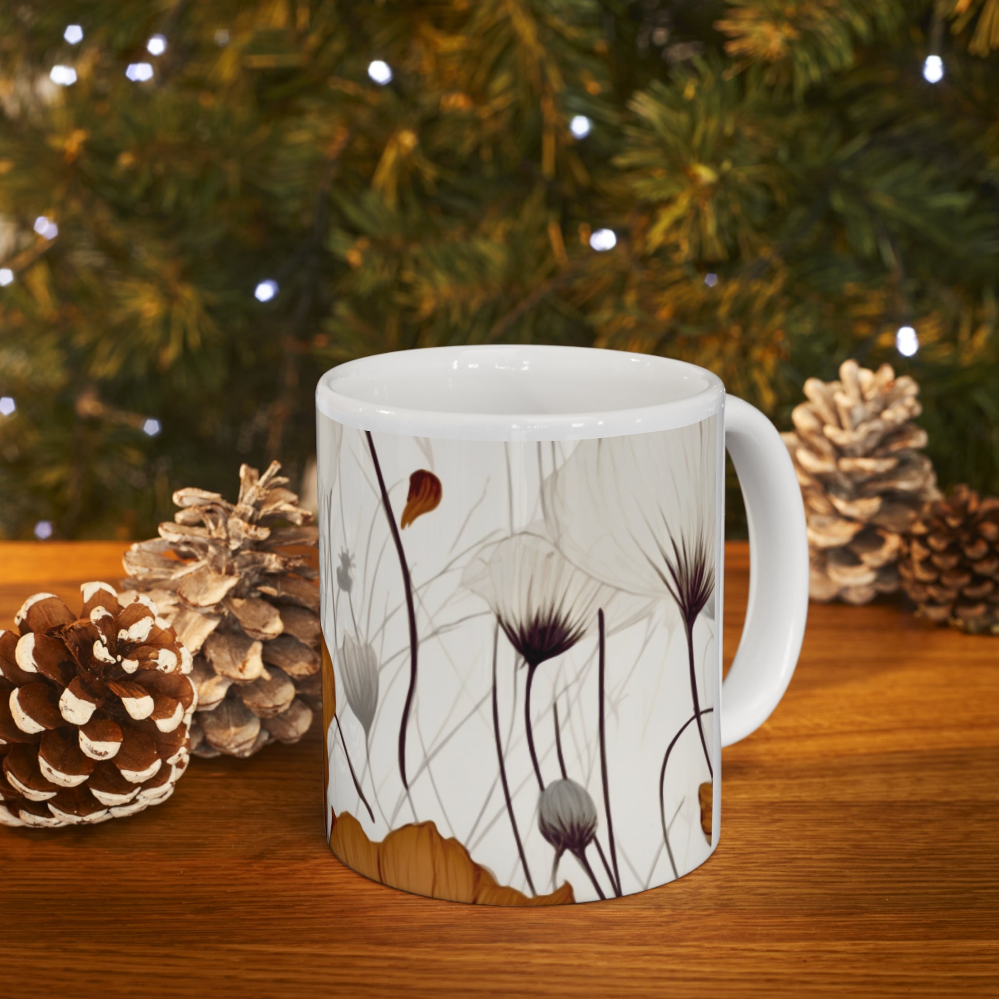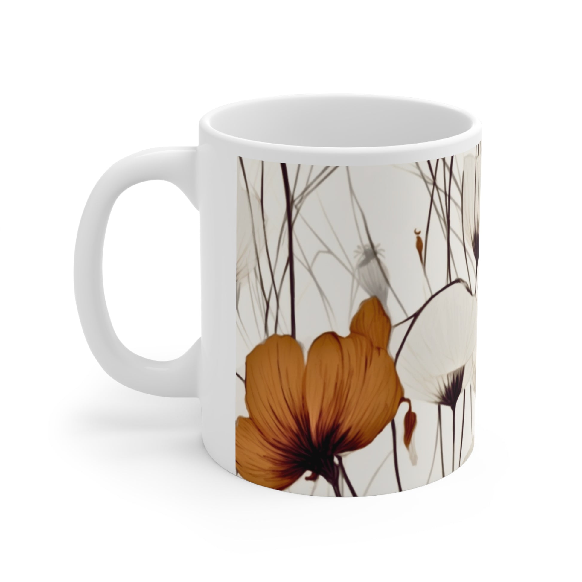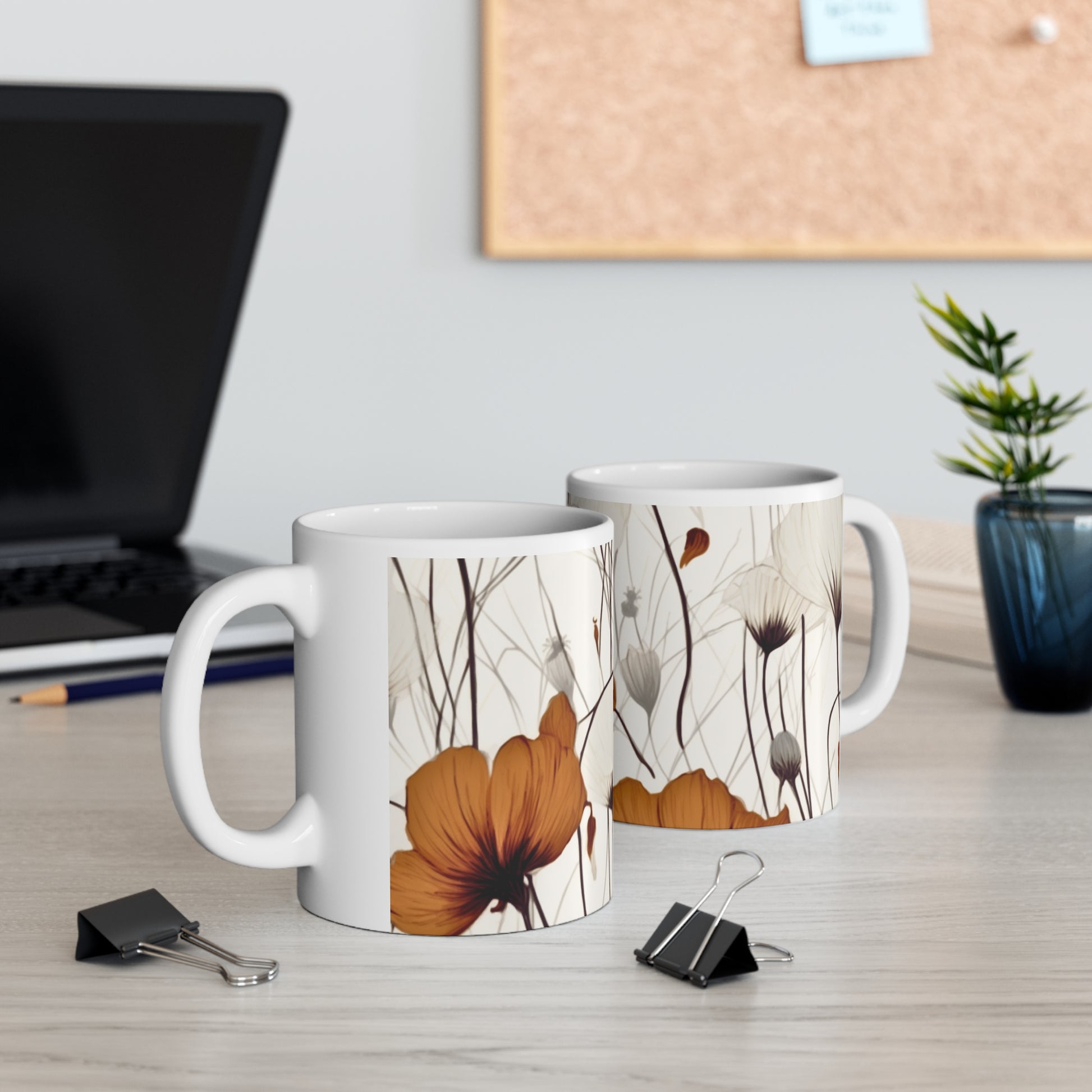 Neutral Style Brown and White Flowers Ceramic Mug 11oz